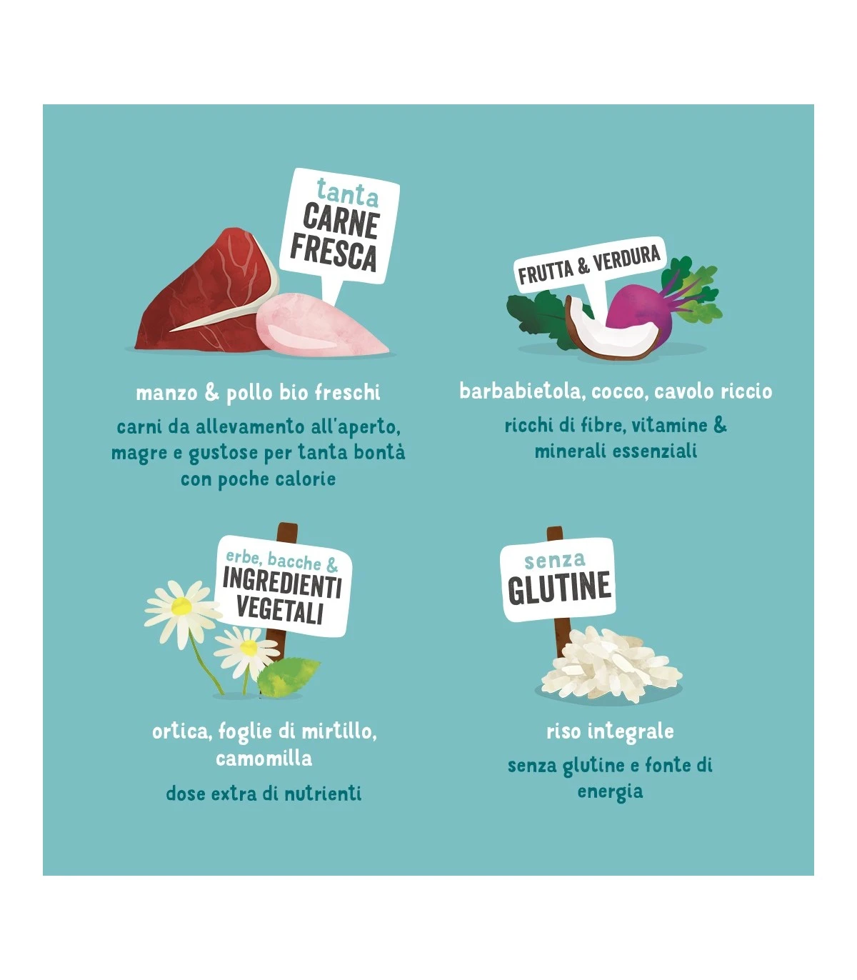 Pollo fresco biologico* (25%), riso integrale biologico*, proteina di riso biologico*, miglio integrale biologico*, manzo fresco biologico* (5%), grasso di pollo biologico*, sughetto di maiale biologico*, minerali, pomodori biologici* (0,04%), carote biologiche* (0,04%), barbabietola biologica* (0,04%), cavolo riccio biologico* (0,04%), cocco biologico* (0,04%), ortica biologica*, foglie di rovo biologico*, finocchio biologico*, cumino dei prati biologico*, camomilla biologica*, melissa biologica*.