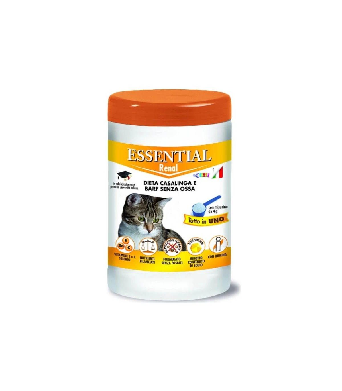 Caratteristiche: ESSENTIAL Gatto Renal è l’alimento complementare, essenziale per l’integrazione della dieta casalinga, a eliminazione, o BARF senza ossa del gatto adulto, ideale per favorirne la corretta funzionalità renale. La vitamina E, la vitamina C e il selenio contrastano lo stress ossidativo grazie alla loro funzione antiossidante.L’inulina, riducendo l’assorbimento di scorie azotate dall’intestino, è utile per migliorare il controllo dell’azotemia. Formulato senza fosfati, con limitato apporto di sodio, e con citrato di potassio, favorisce il mantenimento di un corretto equilibrio elettrolitico , acido-basico e delle normali condizioni metaboliche. Contiene vitamine, macroelementi e oligoelementi minerali, normalmente carenti nelle diete casalinghe. I nutrienti antiossidanti supportano il sistema immunitario; il corretto apporto di calcio e di vitamina D contribuisce al benessere dell’apparato scheletrico, evitando i rischi di carenze o di possibili eccessi. Ad elevata tollerabilità, poiché formulato con sole proteine idrolizzate, che ne aumentano l’appetibilità.