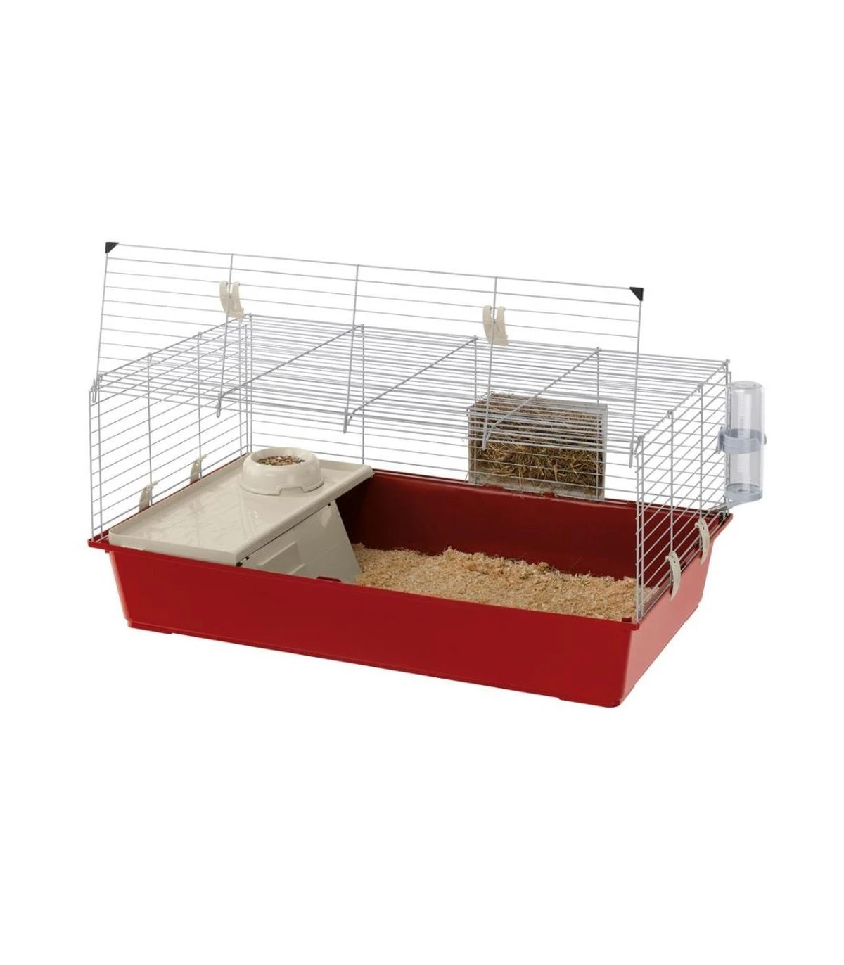Dovete ospitare in casa un simpatico roditore? Niente di più semplice grazie alla gabbia per conigli Rabbit 100. Questo habitat risulta particolarmente ampio, dotato di apertura frontale con agganci di chiusura in plastica per la massima sicurezza dell’animale. Rabbit 100 è dotato di fondo in plastica e struttura in rete metallica verniciata.