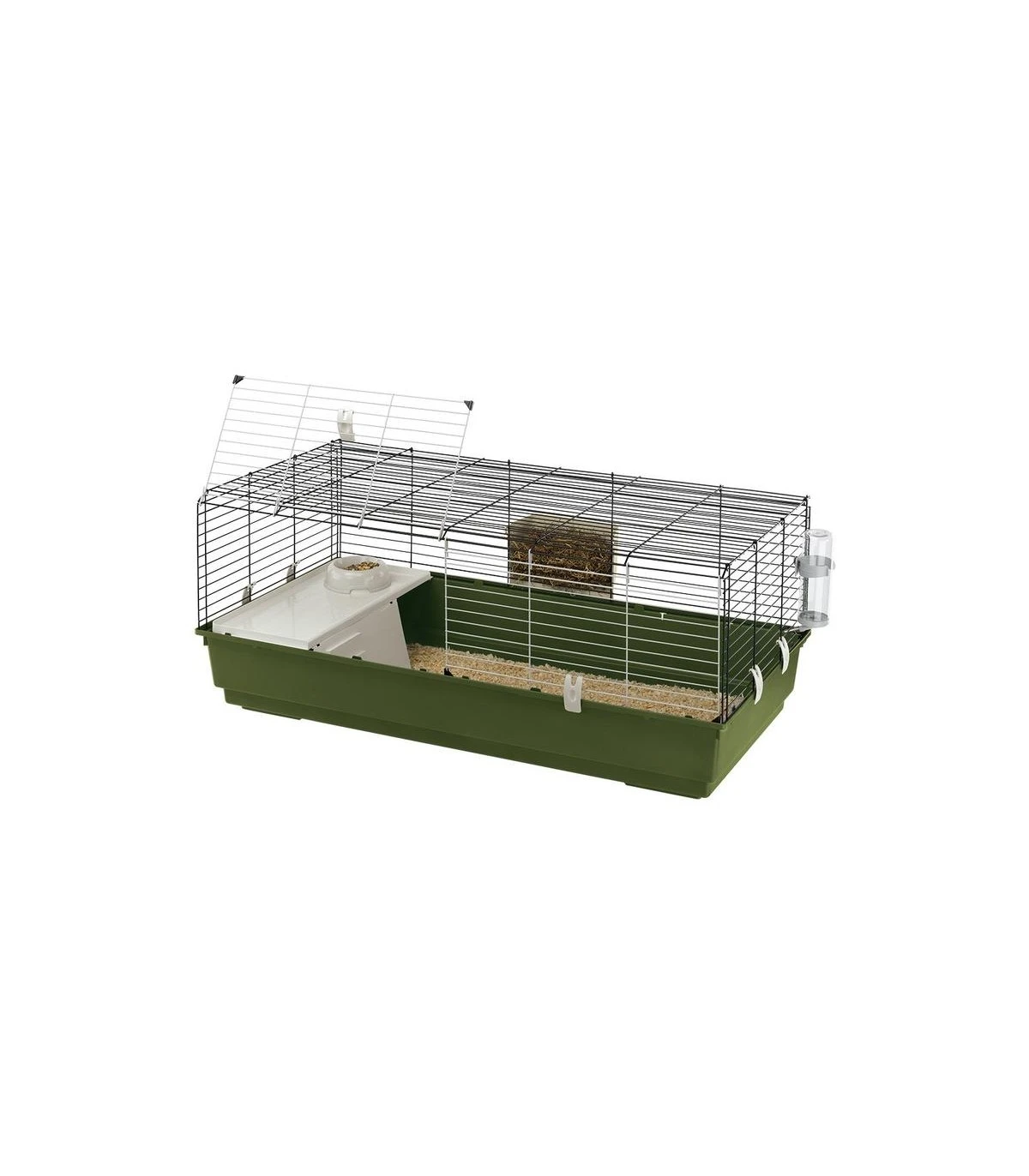 La gabbia per conigli e porcellini d’India Rabbit 120 possiede un interno spazioso dotato degli accessori indispensabili per accogliere il vostro amico: la mangiatoia per il fieno, un beverino per l’acqua, una casetta per il riposo e una ciotolina, il tutto realizzato in plastica.