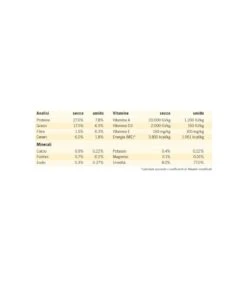 Additivi fisiologico-nutrizionali: vitamina A (23.000 UI/kg), vitamina D3 (800 UI/kg), ferro (24 mg/kg), iodio (2,4 mg/kg), rame (7 mg/kg), manganese (31 mg/kg), zinco (135 mg/kg), selenio (0,03 mg/kg). Conservanti – Antiossidanti.