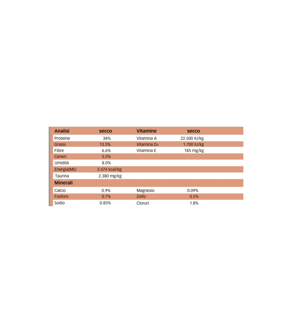 Secco: mais, uova, farina di pesce, grasso di pollo, lievito, farina di pollo, cellulosa, vitamine e minerali, krill antartico, cloruro di sodio, fibra di psyllium, polpe di bietola, fegato di pollame (idrolizzato), proteine del latte (idrolizzate), olio di pesce, estratto di lievito idrolizzato (fonte di MOS), fruttoligosaccaridi (FOS), glucosamina, condroitina solfato, estratto di thè verde.