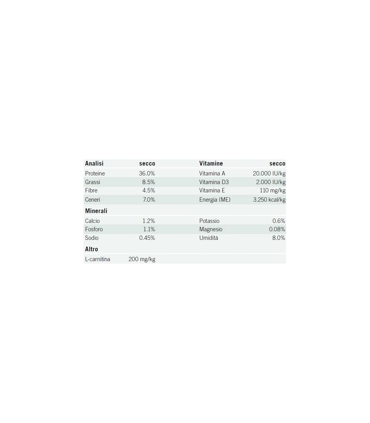 Secco:Â cereali (riso, mais), carne e derivati di origine animale (pollo), estratti di proteine vegetali (glutine di mais), pesce e derivati del pesce, derivati di origine vegetale (cellulosa), minerali, oli e grassi (olio di pesce), uova e ovoprodotti, lievito